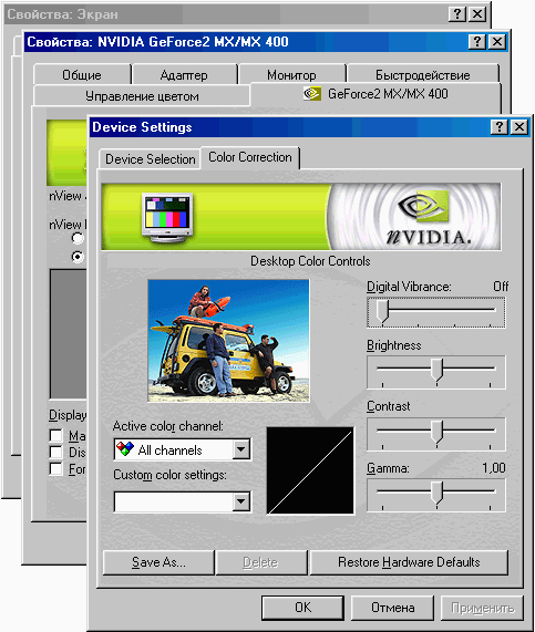 Примечание: TVTool, при всех своих достоинствах, не поддерживает мультимониторность. Это не было критично при работе с картами на базеGF2 и GF3, но для желающих полноценно использовать TwinView (nView) на картах GF4 рекомендовать ее, пожалуй, не будем. Для них — следующий раздел :