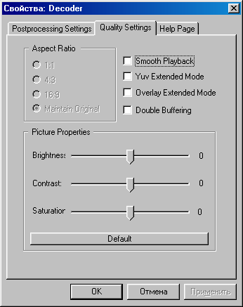 Функция переворачивания картинки »Flip video», аналогичная по действию такой же функции в DivXG400. Меняя IDCT, можно попытаться улучшить качество или уменьшить нагрузку на процессор за счет разных способов декодирования.