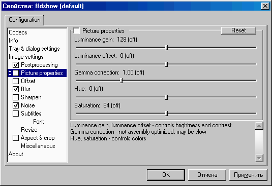 Настройка яркости, контрастности и гаммакоррекция в FFDShow выведена в отдельную закладку.