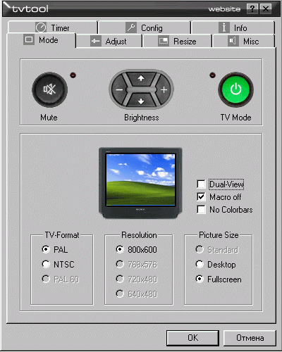 К счастью, есть средство, избавляющее от головной боли в области настроек TV-out. На сайте на данный момент доступна для скачивания Beta 6.0b программы TVTool. Программа является платной, однако это к теме нашего разговора, опять-таки, не имеет отношения, могу посоветовать разве что регулярно посещать конференцию :-).