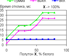 | Времена отклика при переходе от черного до полутона X. | Времена отклика при переходе от полутона X до белого. |