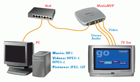 Аббревиатура MVP расшифровывается очень просто — Music, Video, Pictures и означает, что, подключив устройство обычным сетевым кабелем с разъемами RJ-45 к хабу (свитчу, роутеру) или напрямую к сетевой карте, мы получаем возможность воспроизведения видео на телевизионном экране и прослушивания музыки на любом оборудовании, имеющем аудиовход. При этом мало того, что файлы могут находиться на любом компьютере сети (конечно, при наличии доступа), так еще и отсутствует необходимость в шумящем ящике с монитором в квартире, витая пара стабильно передает сигнал на расстояниях до 100 метров.