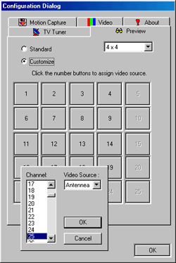 Довольно богатые возможности предоставляет режим PreView. Количество окон, на которые делится экран в этом режиме, может изменяться от 4 до 25. Особенно удобно то, что каждому окну можно присвоить конкретный канал: