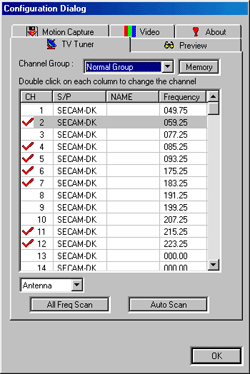 Настройки программы довольно удобные. Все найденные каналы можно разделить на группы. Имеется автоматически создаваемая Standart Group и неограниченное количество пользовательских Memory Group. Но задать принудительно произвольную частоту нельзя. Для каждого входа (tuner, composite и S-Video) отдельно задается тип видеосигнала. В настройках выбирается метод отображения видеооверлея (overlay surface или primary surface), фиксированные соотношения сторон экрана (3:4) и рамка экрана.