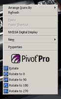 Теперь оценим самое вкусное — поддержку поворота экрана (Pivot). Для этого установим прилагающееся программное обеспечение Pivot Pro, перезагрузим компьютер и увидим в трее новую иконку, которая позволяет перевернуть изображение на экране шагом в 90 градусов. И при правом клике на рабочем столе те же функции доступны.