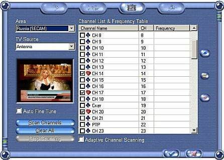 после чего появляются все каналы. Секрет функции Adaptive Channel Scanning проясняется сразу, обратите внимание на изменение надписи в окне Area с Russia (SECAM) на Custom Defined, то есть сканирование всего диапазона, причем если выбрать Custom Defined сразу (последняя надпись в столбце стран) — результат будет тот же. Что послужило причиной такого казуса, неверные представления инженеров Leadtek-а о нашей сети или же неверные представления наших телевизионщиков о вещательной сетке — сказать трудно.