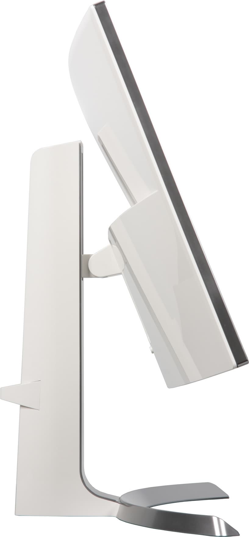 Подставка состоит из двух частей — из основания и стойки. Чтобы выдержать приличный вес монитора, основание стойки изготовлено из алюминиевого сплава и только сверху прикрыто кожухом из пластика, а несущие элементы стойки изготовлены из стали. Кожух основания и фронтальная часть кожуха стойки имеют серебристое покрытие, а задняя часть кожуха стойки — белая, зеркально-гладкая, как и задняя панель блока экрана. Кабели, идущие от разъемов монитора, можно прижать к стойке входящей в комплект поставки скобой из пластика.