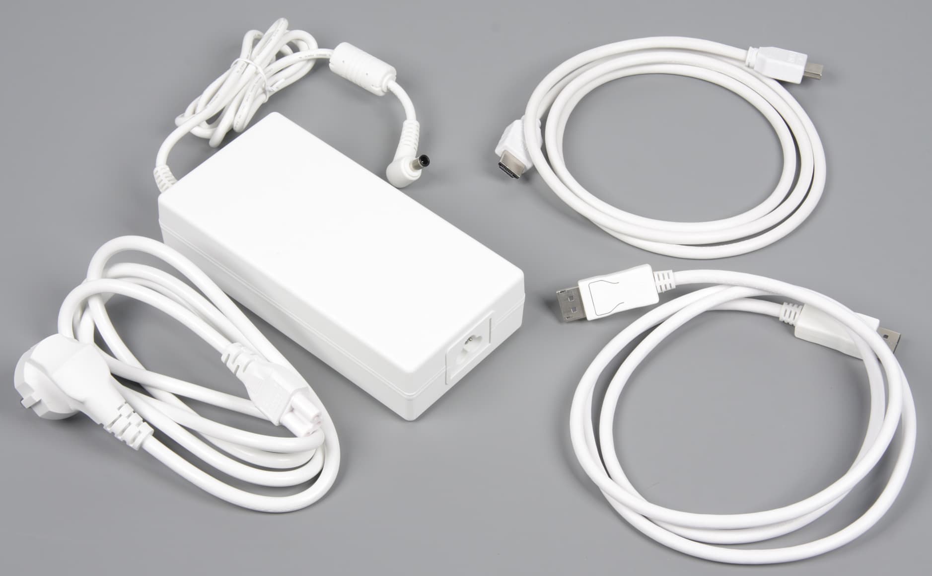 Разъем питания и все интерфейсные разъемы размещены в неглубокой нише на задней панели и ориентированы назад. Монитор оснащен внешним блоком питания. Все, по крайней мере из доставшихся нам, кабели и блок питания — белого цвета, что сочетается с основным цветом корпуса монитора.