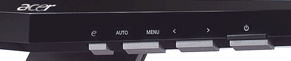 Внизу наплыв, так что логотип размещается почти горизонтально. Кнопки меню расположены на нижнем торце, но заметны и спереди, подписи — на рамке. Цвет пластика кнопок — светло-серый с серебристым оттенком. Такого же цвета накладки с боков. Но всё это в глаза не бросается, и монитор выглядит скорее чёрным в целом. Задняя часть тоже, но пластмасса там уже матовая.