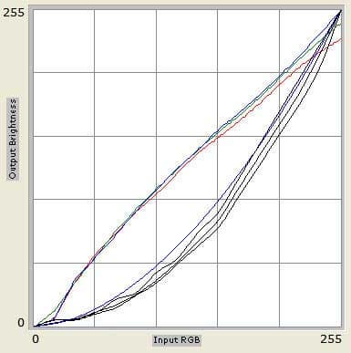 Ниже приведены графики гамма-кривых, где можно увидеть, насколько гамма-кривые индивидуальных цветов (черные линии) отклоняются от целевой гамма-кривой (синяя линия) и какая требуется коррекция для каждого цвета (соответственно красная, синяя и зеленая линии).
