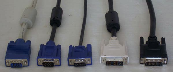 Слева направо: «правильный» VGA от Sony, нормальный VGA, «мышиный хвост» из комплекта поставки, нормальный DVI из комплекта поставки, DVI Dual Link; обратите внимание на количество контактов