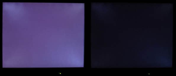 При высокой яркости в тёмной комнате (!!!) заметна засветка в углах, лучами к центру. Выражен этот эффект не очень сильно, ЖК-мониторов без его проявления в тёмной комнате и на максимальной яркости я не встречал. А в остальном чёрное поле равномерное. Снимки с разной экспозицией, реальность ближе к тому, что темнее (справа).