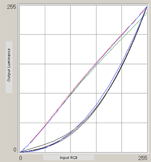 Комментарии излишни — цветопередача отстроена практически идеально. Лишь яркость зеленого канала чуть-чуть завышена в верхней половине полутонов. А в остальном — прекрасно. Интересно, что монитор Samsung на схожей матрице был существенно хуже настроен. Видимо, ноу-хау NEC не зависит от поставщиков и типа матриц — они стабильно и очень грамотно подходят к качеству представленного на рынке во всех сегментах товара.