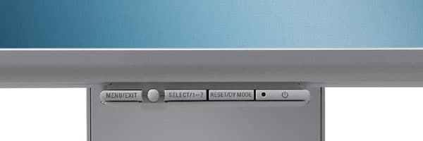 Если же говорить о внешнем виде, то у модели новая (для NEC) и эргономически выверенная конструкция с круглой подставкой, которая мягко вращается вокруг вертикальной оси, кронштейн с широчайшим диапазоном регулировки по высоте и сам экран с тонкой рамкой, под которой размещен блок кнопок меню и джойстик.