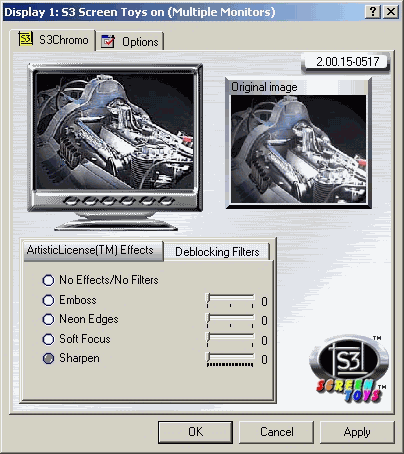 Если такие эффекты как Neon Edges и Emboss несут, скорее, эстетическую нагрузку и служат, в основном, для демонстрации возможностей чипа, то средние настройки Deblocking Filters, неплохо помогают при просмотре MPEG-4. Пользу от увеличения четкости тоже оспорить трудно. Изменение нагрузки на процессор зависит от выбираемого эффекта. Так, применение Deblocking Filters к DVD сказывается на производительности не очень хорошим образом, с другой стороны, вероятность такого использовании этой возможности не слишком отличается от нуля.