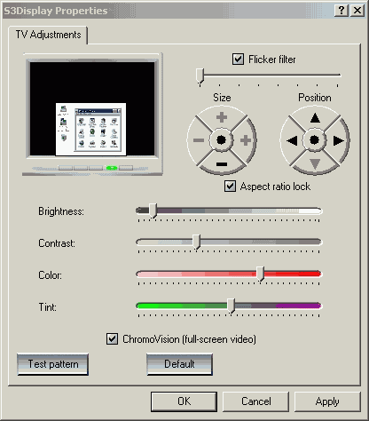 Качество TV-out у S3 заслуживает высокой оценки. Четкость изображения даже при включенном фильтре мерцания выше, чем, например, у видеокарт от ATI. С цветопередачей также все в порядке. Похвально.