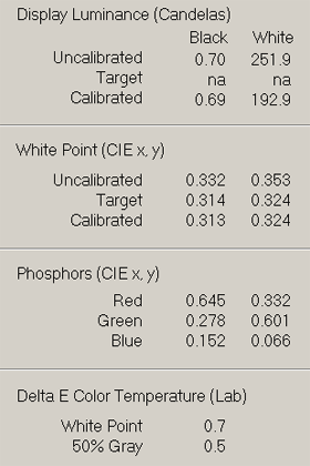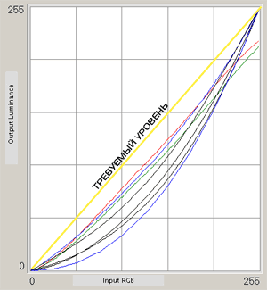 И все же формально рассчитанный коэффициент контрастности в 360:1 позволяет в целом одобрительно покачать головой. Но при этом взгляд на качество цветопередачи заставит изменить направление движения головой — в этой компоненте 225MW нехорош — «перевраны» все полутона. В зону более высокой яркости. Есть и разбежка индивидуальных каналов — «впереди паровоза» идет зеленый, затем его почти догоняет красный, а синий пытается как-то соответствовать заданным значениям. Но и ему это не удается.