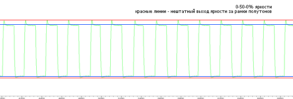 Надо сразу заметить, что циклы матрица дает весьма нестабильные. Скорость гашения между циклами может изменяться до 2мс. Поэтому в таблице даны усредненные цифры. И еще — в режиме 0-50-0 налицо уже знакомый эффект ошибки overdrive — реально матрица выполняет скачок яркости выше заданного, а потом быстро падает до нужного значения. Подобное мы уже иллюстрировали в случае 193P+.