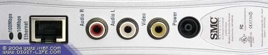 На задней панели расположены аудио- и видеовыходы, коннектор RJ-45, индикаторы режима работы проводного интерфейса (10/100 Мбит/с) и разъем питания.