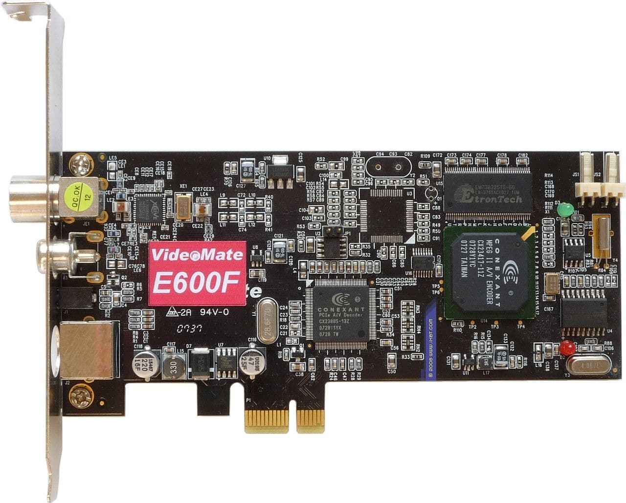 Compro VideoMate Vista E600F — TV- и FM-тюнер с интерфейсом PCI-Express и поддержкой аппаратного сжатия в MPEG2. Селектор Xceive XC3008ACQ, 10-битный АЦП Conexant CX23885-13Z, MPEG1/2-кодировщик Conexant CX23417-11Z.