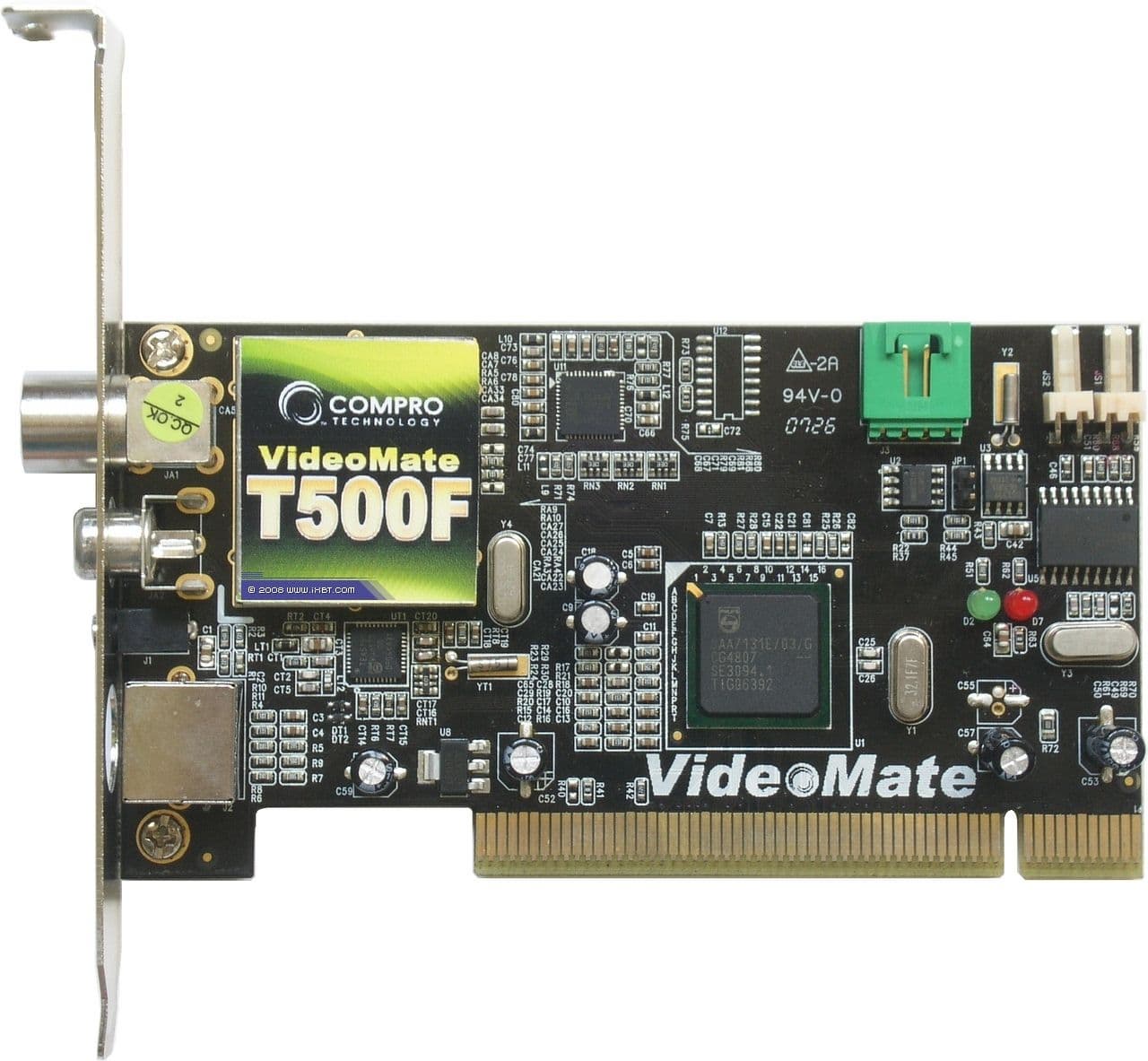 Compro VideoMate Vista T500F — гибридный TV- и FM-тюнер с интерфейсом PCI. Cелектор NXP TDA18271HD, 9-битный АЦП Philips/NXP SAA7131E, COFDM демодулятор Philips/NXP TDA10048HN.