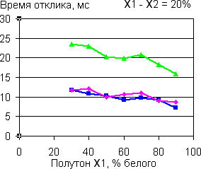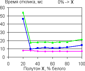 | Времена отклика при переходе между полутонами с разницей 20%. | |
