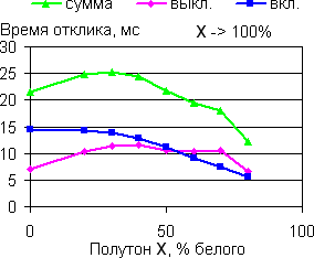 | Времена отклика при переходе от черного до полутона X. | Времена отклика при переходе от полутона X до белого. |