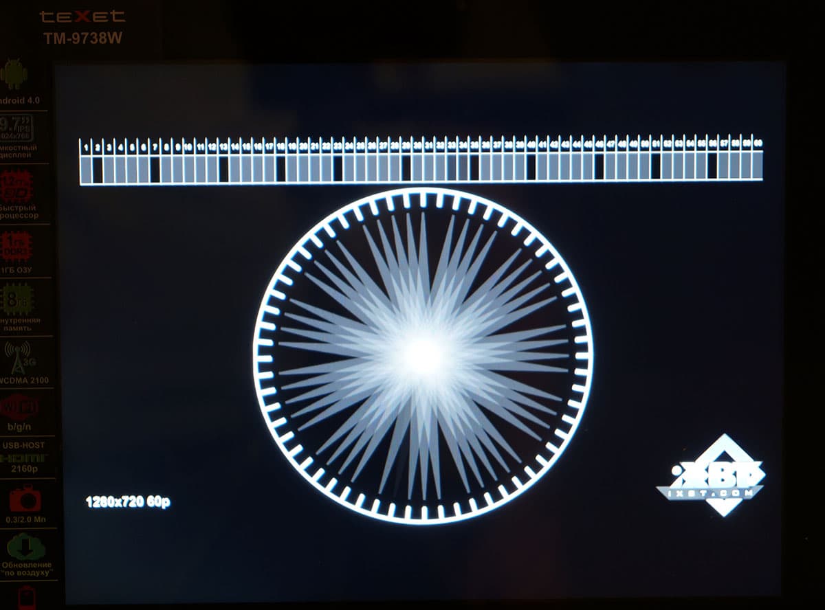 Закрепим нашу догадку с помощью обычного недорогого Android-планшета. Да чего тут скрывать — это Texet TM-9738W. Запустим воспроизведение имеющихся файлов, и сфотографируем экран планшета. Затем подключим планшет к ТВ посредством HDMI, и повторим опыты. Только фотографировать теперь станем экран телевизора.