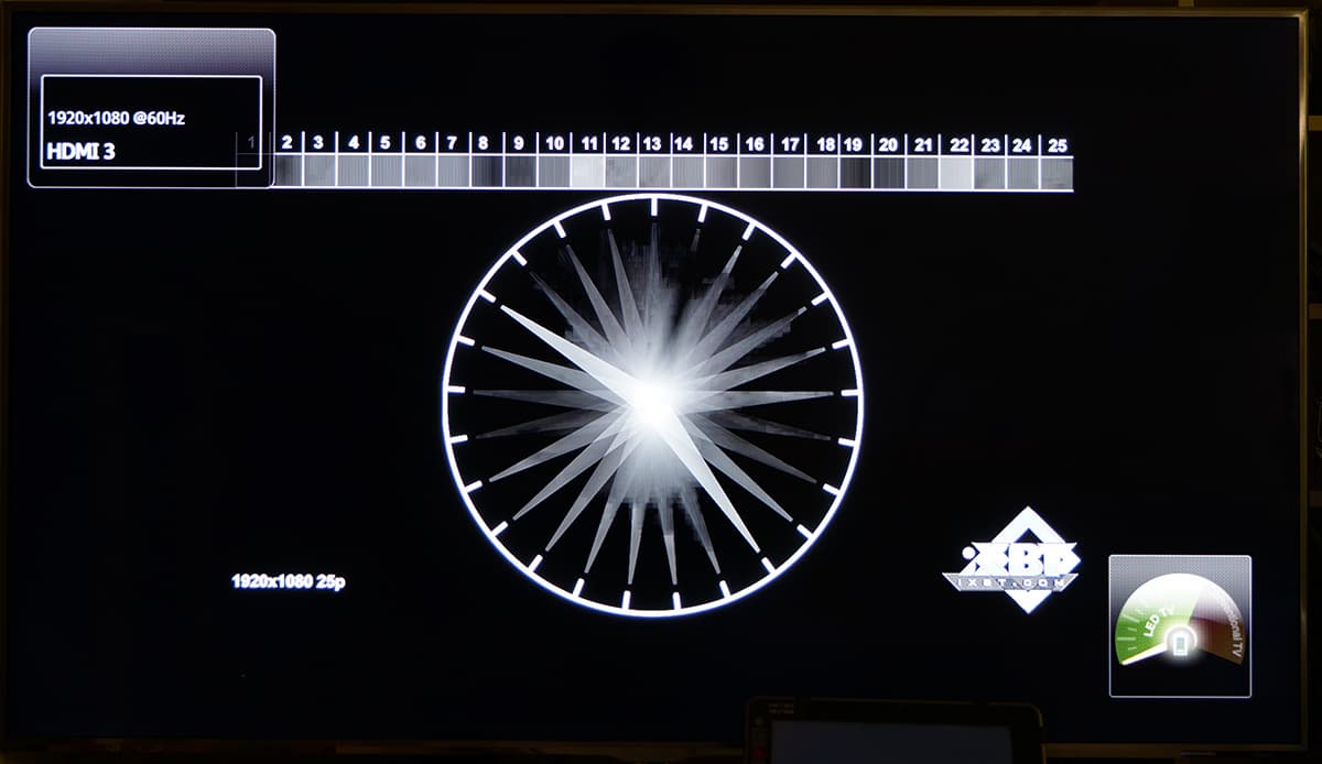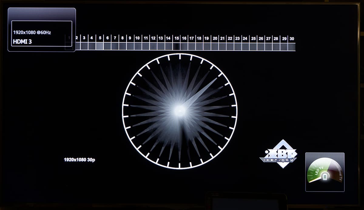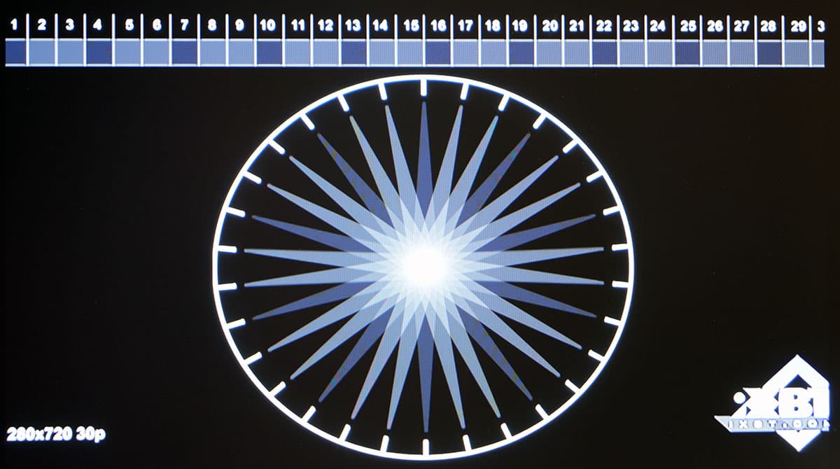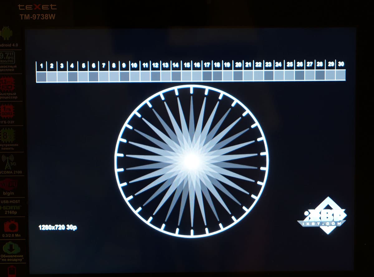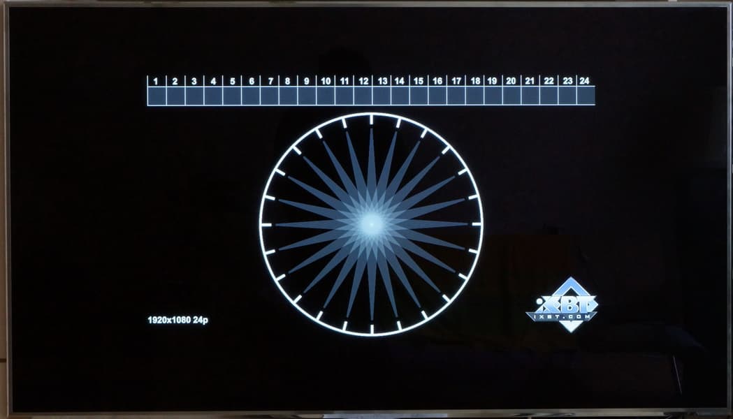 Ярчайшим образом продемонстрировать такой эффект можно, воспроизведя на рассматриваемом устройстве один из специальных видеофайлов. Он представляет собой несложную конструкцию с циферблатом и стрелкой на нем, делающей полный оборот на 360° за одну секунду. Вдобавок над циферблатом расположен ряд пронумерованных ячеек, по которым бегает белый прямоугольник, проходя путь от начала до конца также за одну секунду. Вот он, этот ролик: