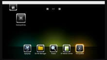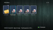 Главное стартовое окно плеера представляет собой привычный набор значков, каждому из которых присвоена какая-либо функция. Отметим наличие в нижней части экрана многочисленных иконок, сигнализирующих об активности того или иного параметра: готовности HDD, наличия подключённого USB-накопителя или карты памяти, наличия сетевого соединения и т. д. Здесь же имеется подсказка, указывающая на возможность ручной переиндексации содержимого жёсткого диска.