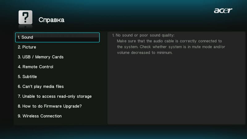 Встроенная справка, к сожалению, не переведена на русский язык. Впрочем, имеющиеся здесь девять пунктов носят скорее декларативный характер, поскольку советы по исправлению неисправностей сводятся к банальному «проверьте, включен ли плеер в розетку».