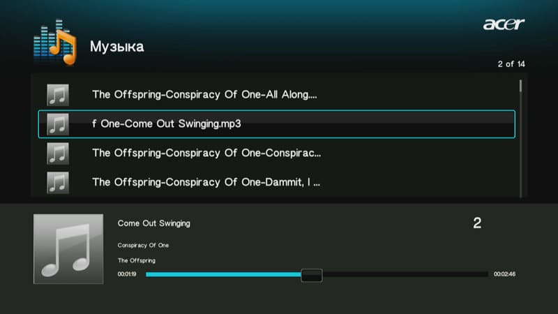 Во время проигрывания музыкальных файлов на экране нет ничего лишнего — только список воспроизведения и полоска, отображающая текущую позицию.