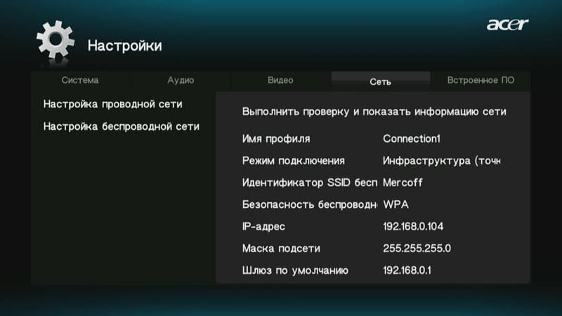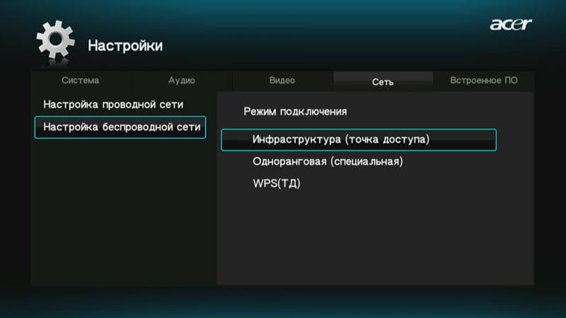 Настройки беспроводного подключения становятся доступны лишь при наличии вставленного в USB-порт плеера Wi-Fi-адаптера.