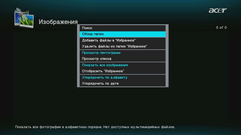 Следует отметить наличие в прошивке плеера довольно удобного и функционального меню, которое появляется по нажатию соответствующей кнопки на пульте ДУ. Команды в этом меню могут различаться в зависимости от ситуации; они позволяют управлять порядком отображения контента, а также копированием/удалением/перемещением файлов и папок.