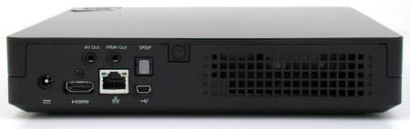 На задней панели устройства расположены: композитный аудио/видеовыход, компонентный видеовыход, оптический цифровой аудиовыход, вход для подключения блока питания, выход HDMI 1.3, разъём сети и порт mini-USB для подключения плеера к ПК в режиме внешнего жёсткого диска. Все эти входы-выходы занимают менее половины площади торца, остальное место отдано… опять радиаторной решётке, на этот раз — впускной.