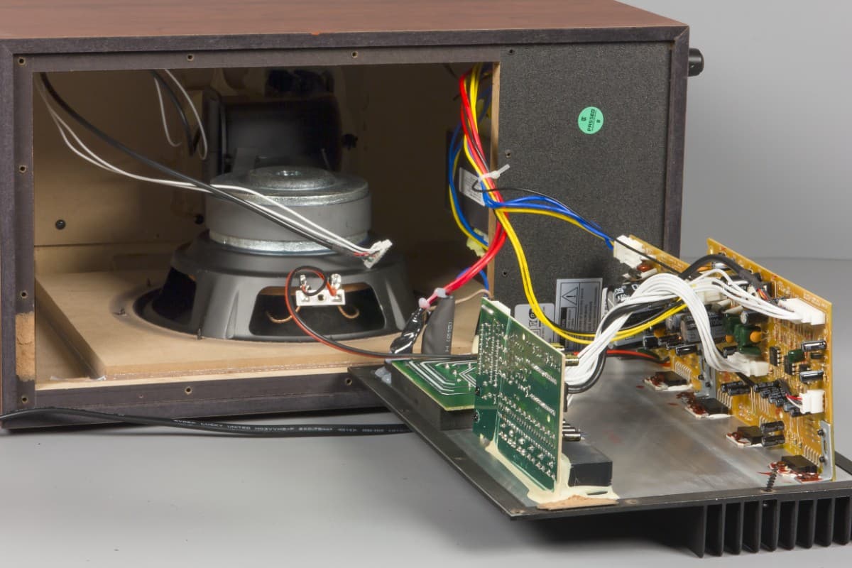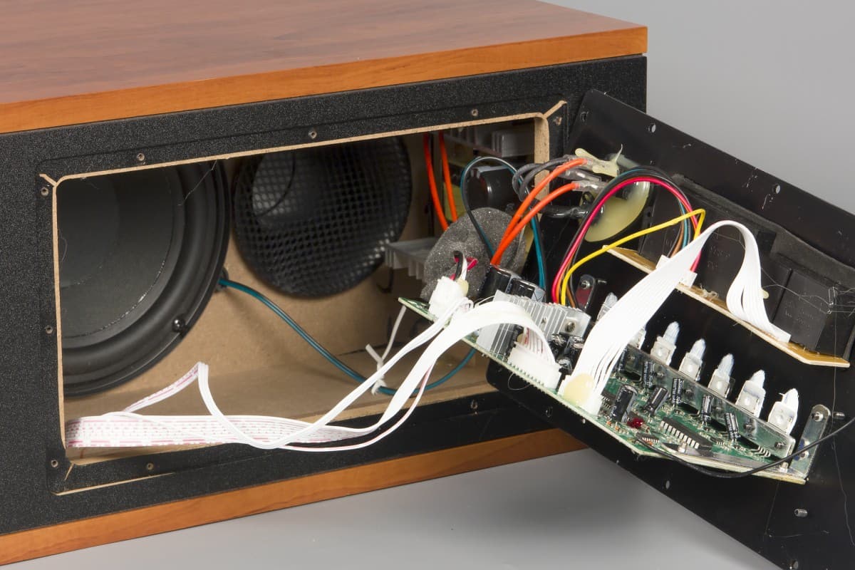 Блок питания и усилитель, как и у Genius, встроены в корпус сабвуфера, на задней стенке которого есть большая прорезь, закрытая металлической пластиной. На этой пластине изнутри закреплена плата усилителей, снаружи — радиатор микросхем УНЧ, входные (RCA) и выходные (подпружиненные зажимы) разъемы, а также механический выключатель питания и гнездо антенны. Оконечный усилитель сделан на семи интегральных усилителях мощности, блок питания выполнен по схеме с преобразованием частоты. Предохранителя, доступного пользователю для замены, нет.