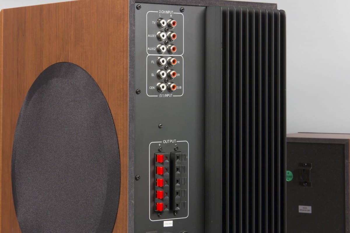 Как и в большинстве подобных комплектов, электронная «начинка» расположена в сабвуфере: в его задней стенке есть большой вырез, закрытый металлической пластиной, к которой изнутри прикреплены платы усилительной части, а наружу выходят разъемы, радиатор усилителей мощности и механический выключатель питания.