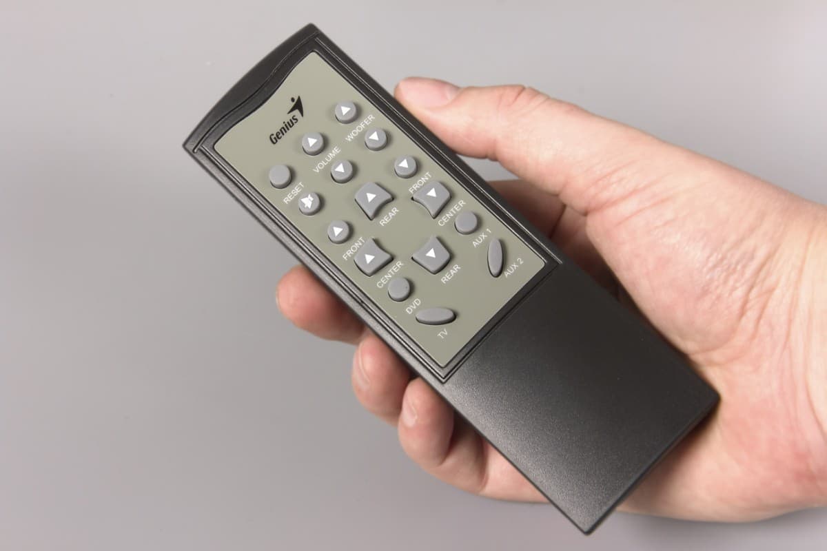 Пульт дистанционного управления немного больше по размеру, чем у Genius, но он благодаря овальной форме он удобнее ложится в руку, а кнопки сгруппированы вполне логично. Питание также от двух щелочных батареек ААА. Кнопки пульта осуществляют полный набор регулировок, настроек и коммутаций, предусмотренных электроникой модели.