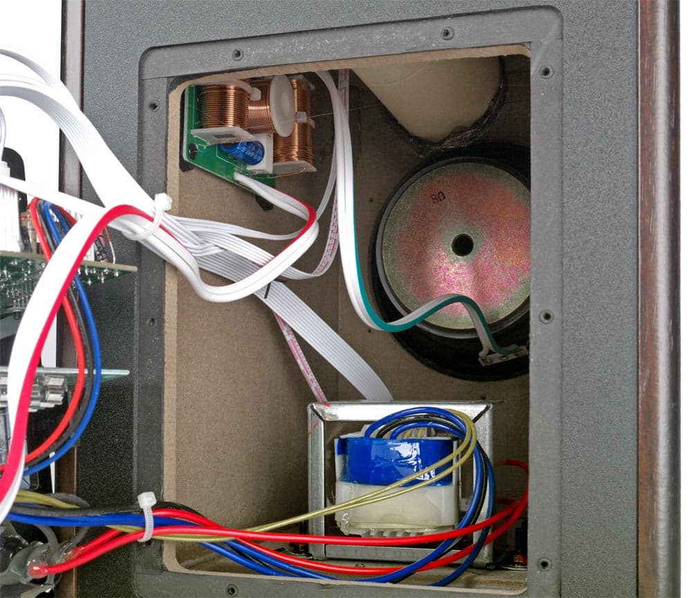 Платы с компонентами разделительных LC-фильтров закреплены на внутренних боковых стенках нижних отсеков обеих колонок. Активная колонка соединяется с пассивной кабелем с разъемами-«бананами» на обоих концах. Кабель достаточно толстый (к сожалению, соответствующей маркировки нет), в мягкой силиконовой оболочке, да к тому же очень длинный: целых четыре метра! Производитель тут явно решил не экономить. А имеющиеся на колонках винтовые зажимы можно использовать и для кабелей без наконечников.