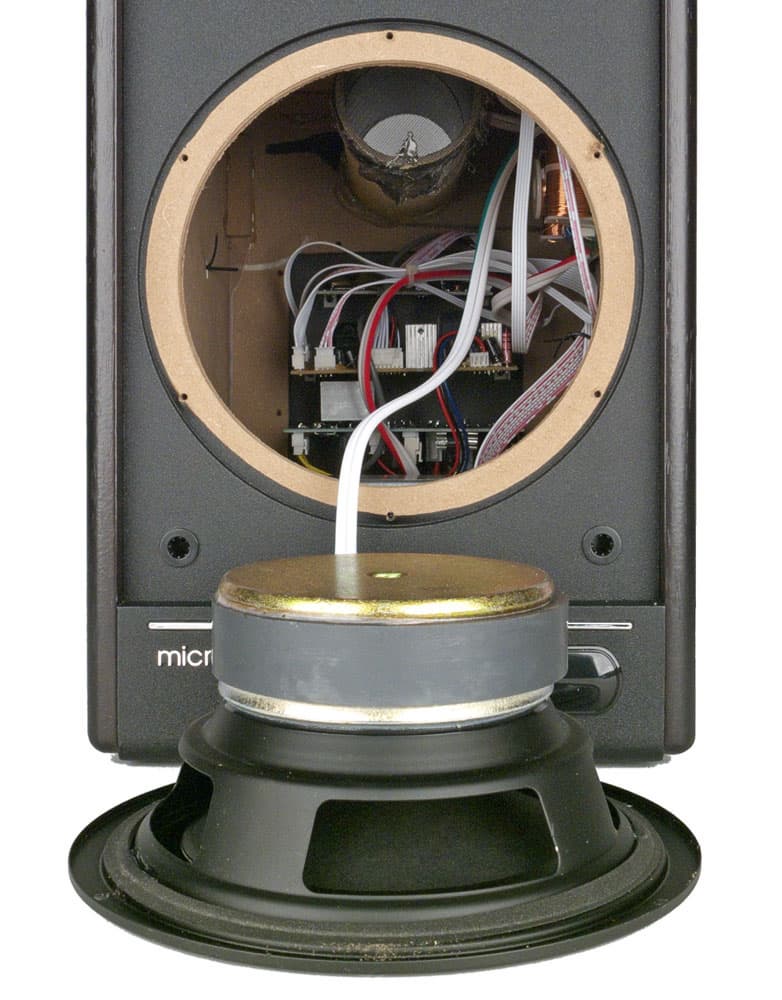 Акустическое оформление то же, что у Solo 7C: внутренний объем колонки разбит сплошной горизонтальной перегородкой на две неравные части, каждая из которых имеет собственный фазоинвертор с выходом на заднюю стенку. Диаметр обеих труб 53 мм, длина 19 см — т.е. немного поуже и заметно длиннее, чем в 7C. В меньшей нижней части, помимо динамика, располагаются еще и электронные блоки. Никаких звукопоглощающих материалов нет, но места стыка с корпусом как динамиков, так и металлической пластины, закрывающей вырез в задней стенке активной АС, снабжены уплотнителями.