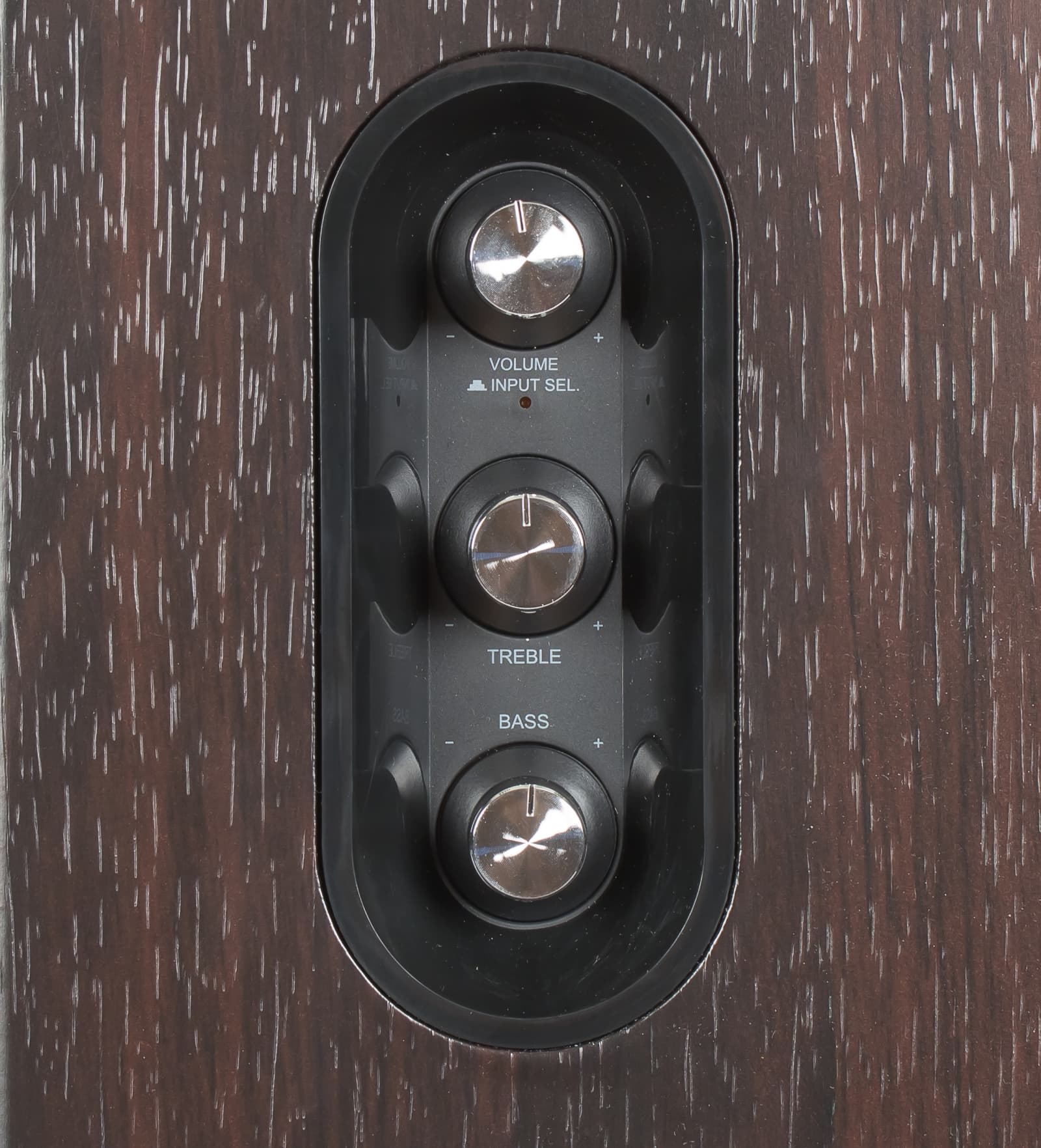 Пока всё без изменений, да и регуляторы — громкости (безупорный, совмещен с переключателем входов) и тембра НЧ/ВЧ (с фиксацией среднего положения) — остались на прежнем месте: в нише с пластиковой вставкой-корытцем на правом боку активной колонки. Там же находится и четырехцветный светодиодный индикатор, показывающий выбранный вход. Насчет удобства расположения регуляторов могут быть разные мнения, но в отношении индикатора можно лишь посетовать, что при модернизации для него не нашли места, на котором он будет лучше заметен.