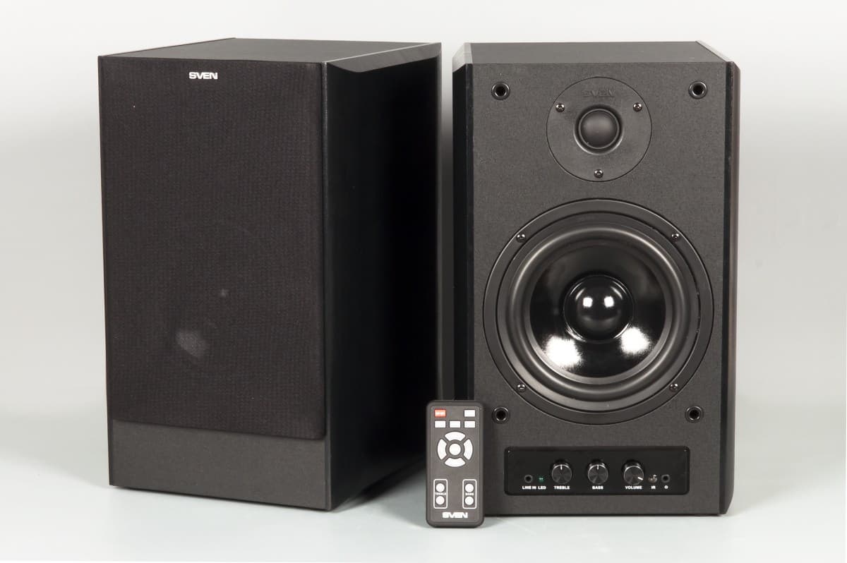 Как и в предыдущей «дуэли», MDF у корпусов колонок Sven более толстый, чем у Microlab — 15 мм вместо 13, но на этот раз рыхлым его не назовешь. Так же, как у Solo 6C, бо́льшая часть лицевых панелей колонок закрыта съемными декоративными накладками из неплотной ткани на каркасе из MDF, только каркас более основательный: пластина с круглыми вырезами под динамики. Внизу тоже оставлена неширокая полоса, которую у активной колонки занимает панель управления. Даже ножки одинаковые: такие же, как у Microlab, «пятаки» из твердой резины.