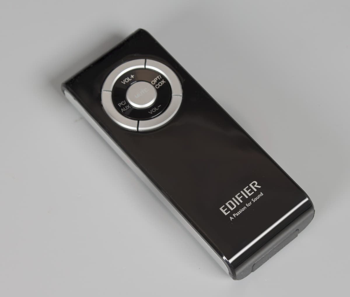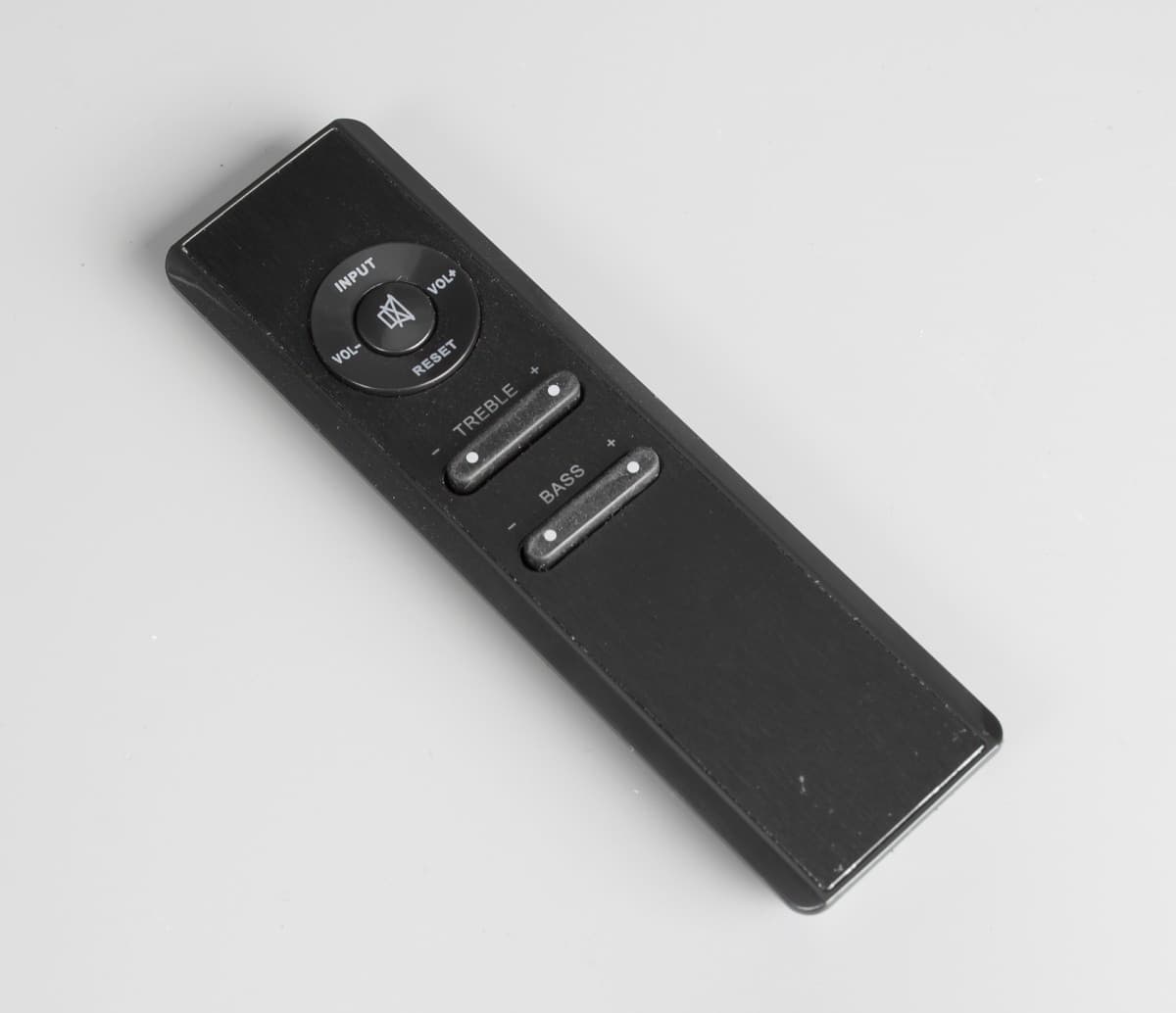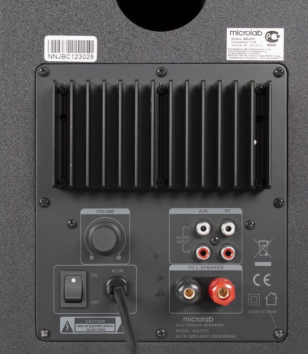 На активной колонке сзади есть безупорный регулятор громкости и тумблер питания, а спереди — ИК-датчик и красный двухразрядный семисегментный индикатор, в цифровом виде показывающий установленные уровни громкости или тембра НЧ/ВЧ, а также отображающий переход в режим Mute и смену выбранного входа, но эти регулировки и режимы доступны только с пульта ДУ, элементом питания в котором служит батарея CR2025.