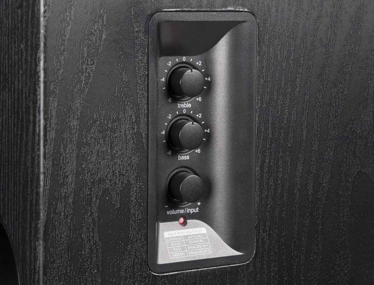 Входов у активной колонки всё также четыре: два аналоговых 2×RCA и два цифровых — коаксиальный и оптический. Переключаются они нажатием на регулятор громкости или с пульта ДУ, а индикация выбранного входа осуществляется цветом светодиодного индикатора на боковой панели. Этот же индикатор отображает включение питания, переход в режим Mute и сопровождает процесс регулировки громкости: мигает, а при достижении максимума или минимума горит постоянно.
