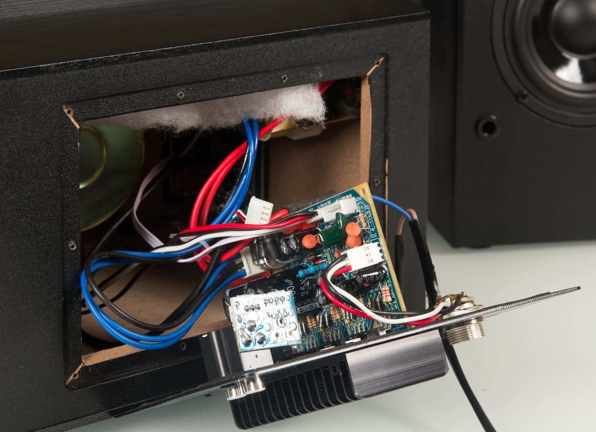 На металлической пластине, закрывающей через уплотнитель вырез в задней стенке активной колонки, снаружи находятся единственный вход 2×RCA, разъем для подключения пассивной колонки, механический выключатель питания и предохранитель, а также радиатор усилителя мощности. В самом низу — отверстие, через которое выведен кабель питания.