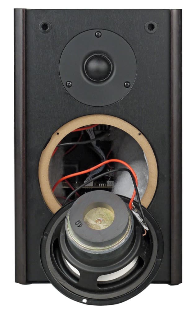 НЧ/СЧ-динамик имеет 9-сантиметровый бумажный диффузор на резиновом подвесе и сопротивление обмотки 6 Ом. Дюймовый купол твитера сделан из полупрозрачного дымчатого полимера, а вот какой-либо маркировки на корпусе нет. Места стыка обоих динамиков с панелью снабжены уплотнителями, а внутри колонок есть звукопоглощающий материал.