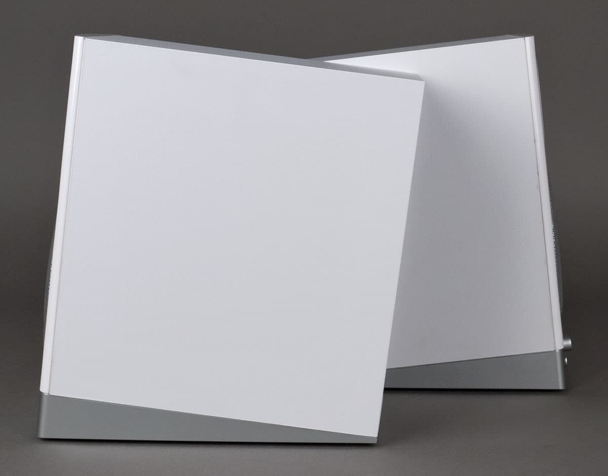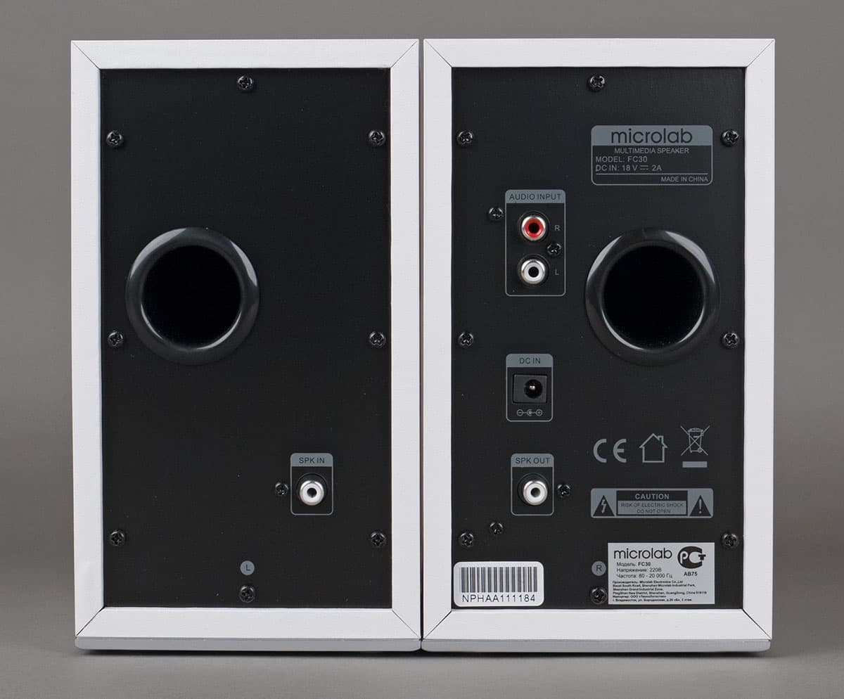 Как и в колонках Genius, фронтальная панель FC30 снаружи оформлена пластиковой накладкой, также глянцевой. У бело-серого варианта глянец в основном проявляется бликами отраженного света, а у черно-красного гарантированы проблемы с отпечатками рук и пылью. Правда, ухаживать за белыми колонками тоже придется тщательно, чтобы избежать грязных разводов, да и немытыми руками за них лучше не хвататься.