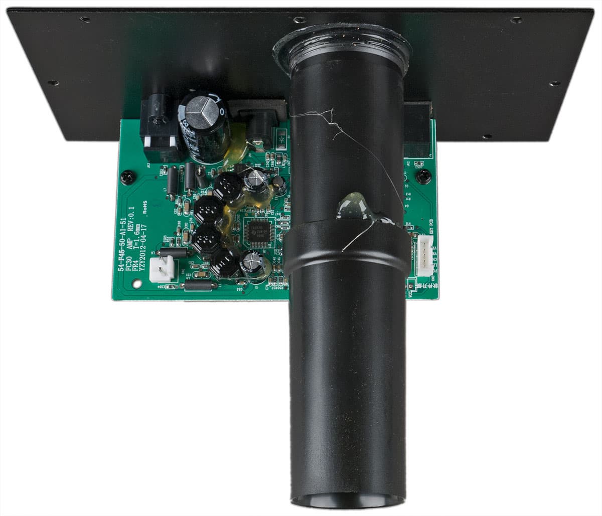 Электроника выполнена в двух блоках. Плата источника питания, сделанного по схеме с преобразованием частоты, расположена на днище активной колонки; БП в отсутствие сигнала на входах усилителя выдает 17 В. Внешнего экрана нет, есть только защитная оболочка, предотвращающая случайное прикосновение к высоковольтным цепям.