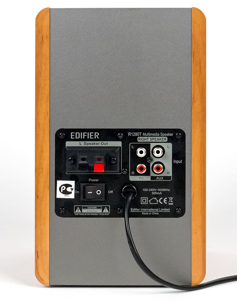 Входов два, оба аналоговые, выполнены с использованием разъемов RCA, закрепленных на металлической пластине, закрывающей вырез в задней стенке активной колонки. На ней же закреплены разъем с подпружиненными контактами для подключения пассивной колонки и механический выключатель питания. Кабель питания без разъема, но отверстие для него уплотнено изнутри и снабжено пластиковой накладкой, предотвращающей перетирание.