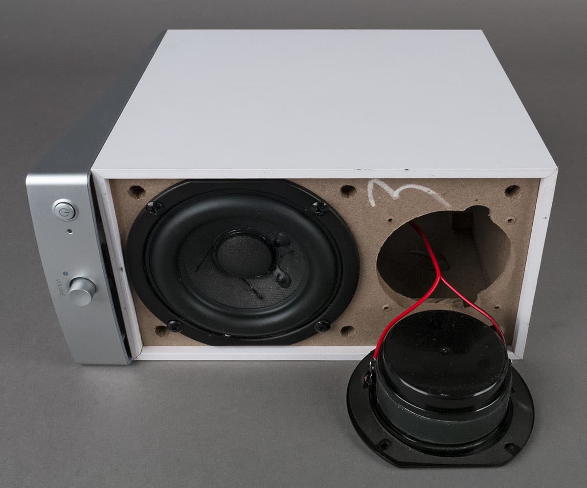 Как и у остальных рассмотренных колонок, для корпусов использован MDF толщиной 9 мм. Стыки как динамиков, так и задней металлической крышки с корпусом снабжены прокладками-уплотнителями, а звукопоглощающих материалов внутри нет.